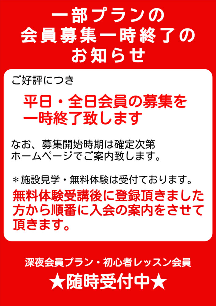 | プラン名 | 平日会員 | 全日会員 | VIP会員 | 深夜会員 | 初心者レッスン |